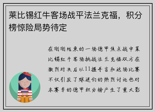 在刚刚结束的一场德甲焦点战中,莱比锡红牛客场挑战法兰克福,双方在激烈对决后以1-1握手言和。这场比赛不仅引发了球迷们的热烈讨论,也对本赛季的德甲积分榜产生了重大影响。
